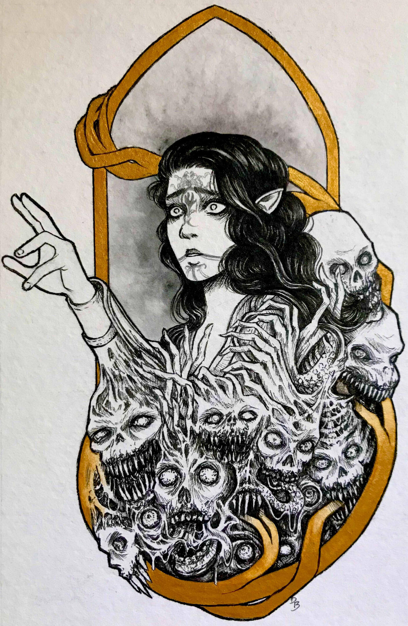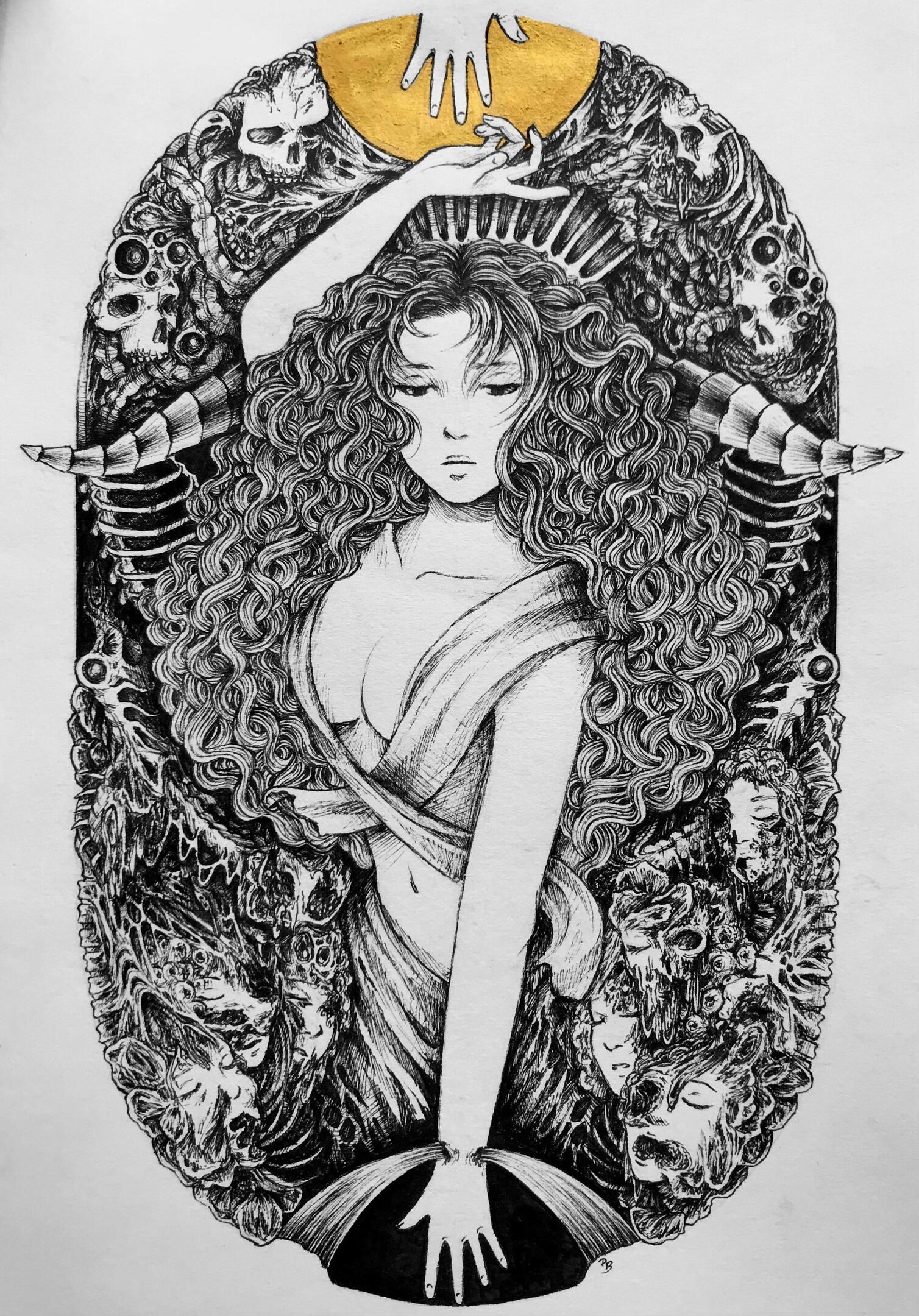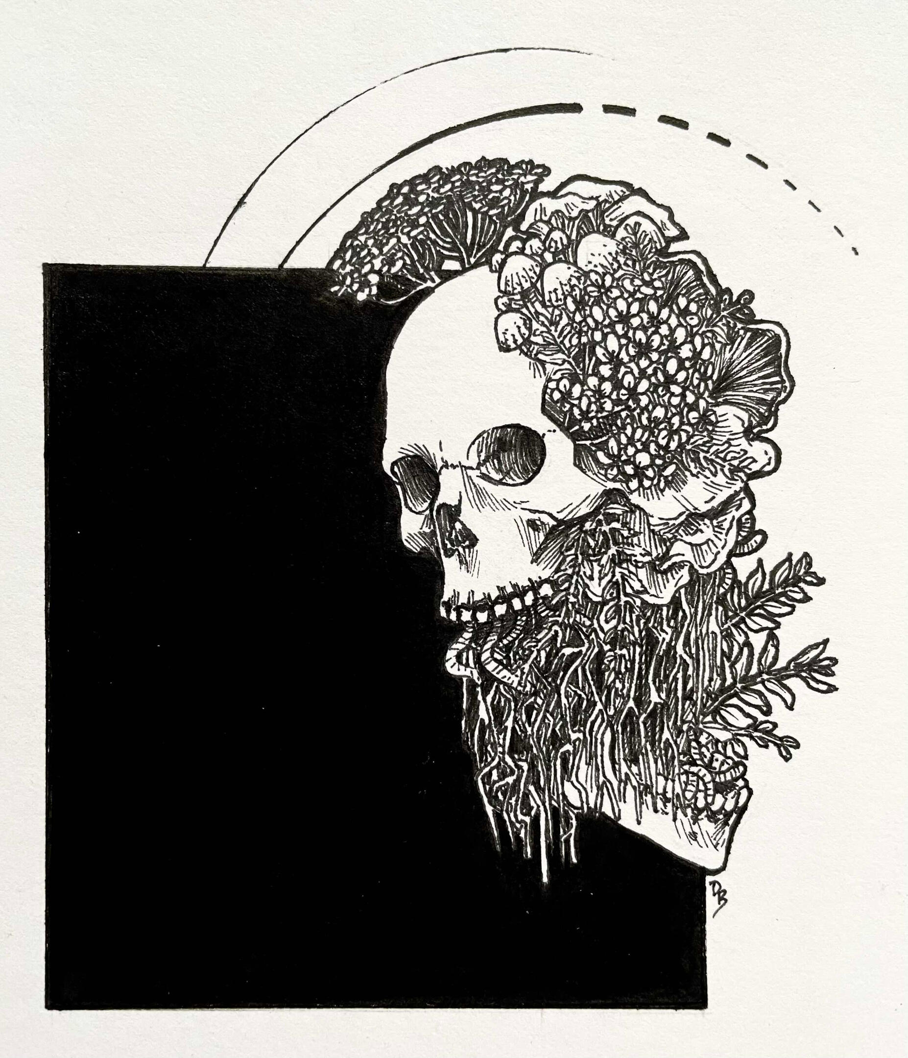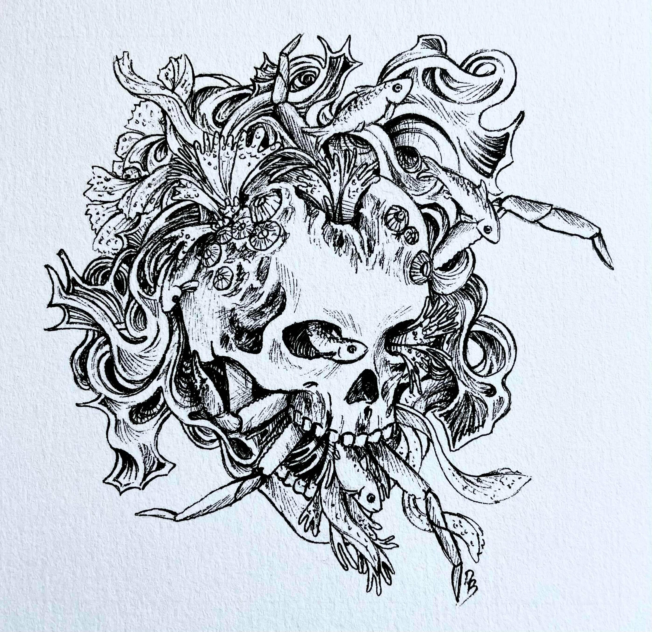Visual art has always been my favorite way of realizing my bountiful imagination and sharing subjects that I find beautiful through the distinct voice that my utensil resonates. In many of my watercolor and acrylic paintings, I strive to capture the beauty of the sea from the everchanging waves to the beautiful shimmer and hues that the sky bestows them. Through my ink drawings, I use intricacy to explore macabre and botanical subjects, from a knotty tree to a human skull with slimy tentacles writhing from within.